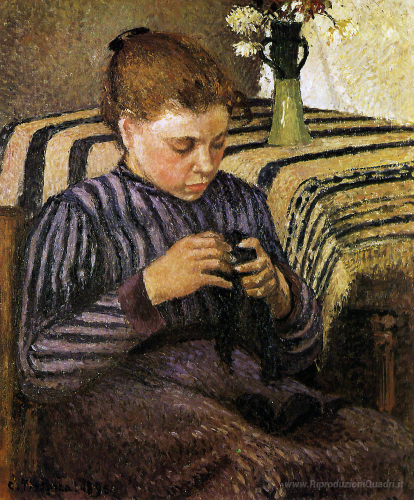 Ti offriamo una riproduzione artigianale su tela dell'opera famosa 'Giovane donna rammendo le calze' di Camille Pissarro, dal Museo delle Riproduzioni.