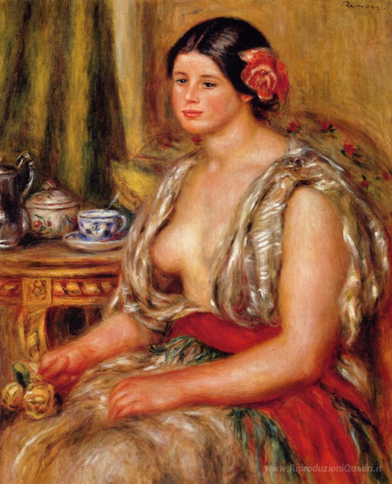 Ti offriamo una riproduzione artigianale su tela dell'opera famosa 'Giovane donna seduta in un costume orientale' di Pierre-Auguste Renoir, dal Museo delle Riproduzioni.