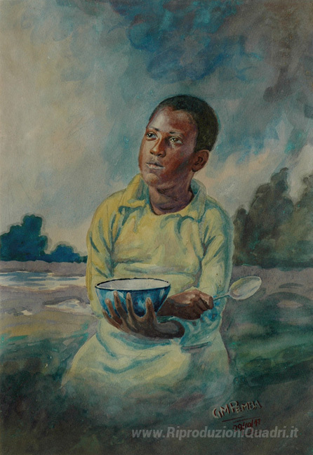 Ti offriamo una riproduzione artigianale su tela dell'opera famosa 'Giovane ragazzo con una ciotola e cucchiaio' di George Pemba, dal Museo delle Riproduzioni.