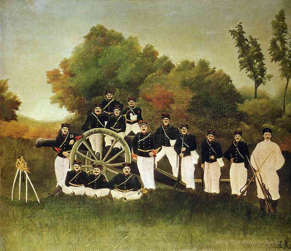 Ti offriamo una riproduzione artigianale su tela dell'opera famosa 'Gli artiglieri' di Henri Rousseau, dal Museo delle Riproduzioni.