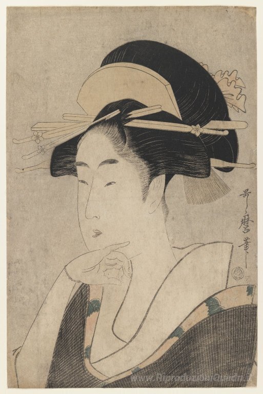 Ti offriamo una riproduzione artigianale su tela dell'opera famosa 'Grande Capo e busto ritratto di bellezza' di Kitagawa Utamaro, dal Museo delle Riproduzioni.