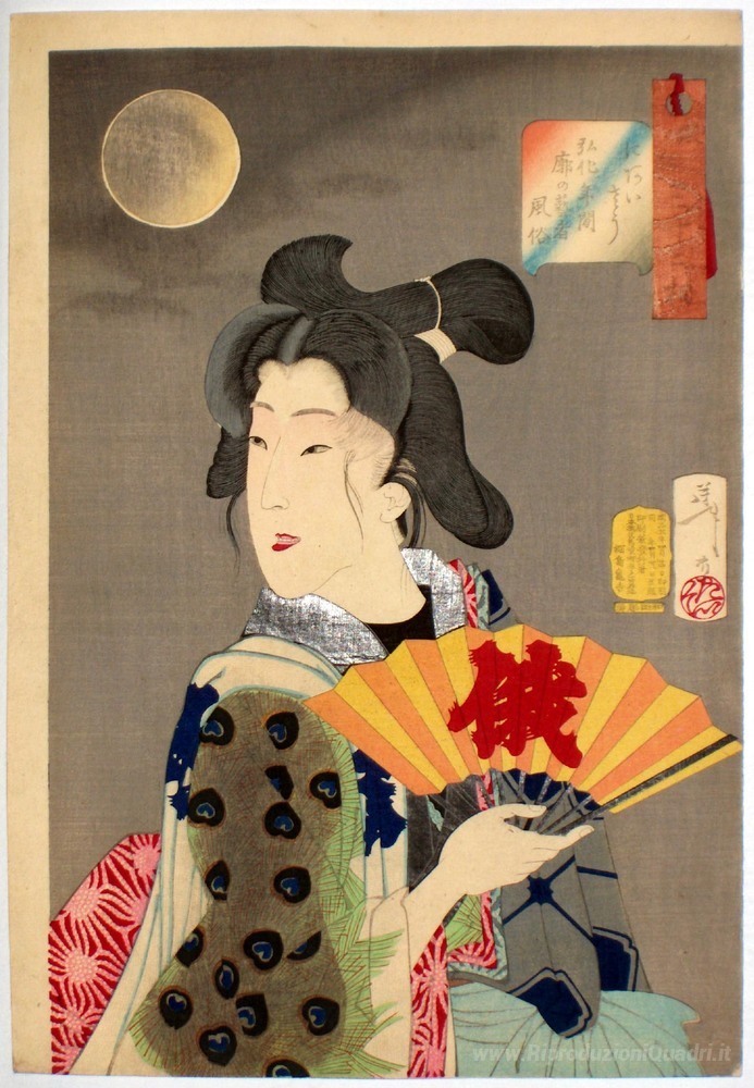 Ti offriamo una riproduzione artigianale su tela dell'opera famosa 'Guardando adatto - l'aspetto di un bordello geisha del Koka Era' di Tsukioka Yoshitoshi, dal Museo delle Riproduzioni.