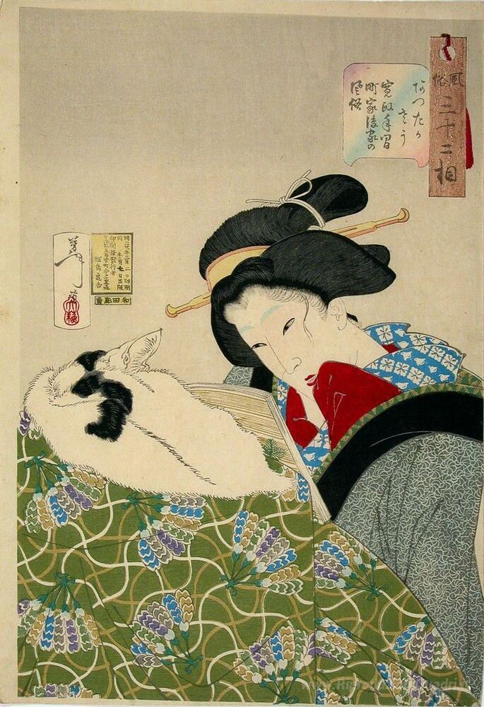 Benvenuti nella nostra galleria virtuale dedicata ai dipinti a olio italiani, dove l'arte incontra la tradizione e la passione. Oggi vi presentiamo il capolavoro Guardando caldo - l'aspetto di una vedova urbana dell'artista giapponese Tsukioka Yoshitoshi. Questo dipinto rappresenta una fusione di stili, in cui l'abilità tecnica dell'artista si riflette in ogni pennellata, creando un'atmosfera unica di introspezione e bellezza.