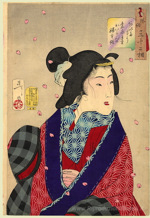 Ti offriamo una riproduzione artigianale su tela dell'opera famosa 'Guardando desiderosi di incontrare qualcuno - La comparsa di una' di Tsukioka Yoshitoshi, dal Museo delle Riproduzioni.