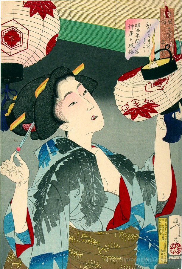 Ti offriamo una riproduzione artigianale su tela dell'opera famosa 'Guardando in grado - L'aspetto di un Kyoto Cameriera in epoca Me' di Tsukioka Yoshitoshi, dal Museo delle Riproduzioni.