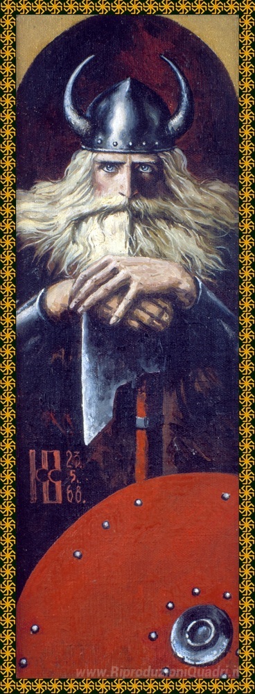 Ti offriamo una riproduzione artigianale su tela dell'opera famosa 'Guerriero scandinavo' di Konstantin Vasilyev, dal Museo delle Riproduzioni.