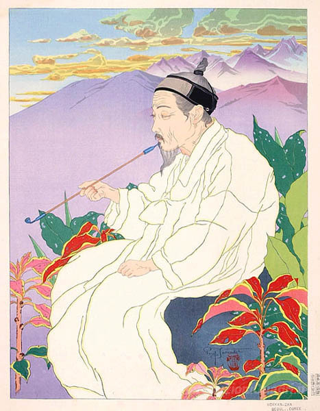 Ti offriamo una riproduzione artigianale su tela dell'opera famosa 'Hokkan-zan. Seoul, Coree' di Paul Jacoulet, dal Museo delle Riproduzioni.