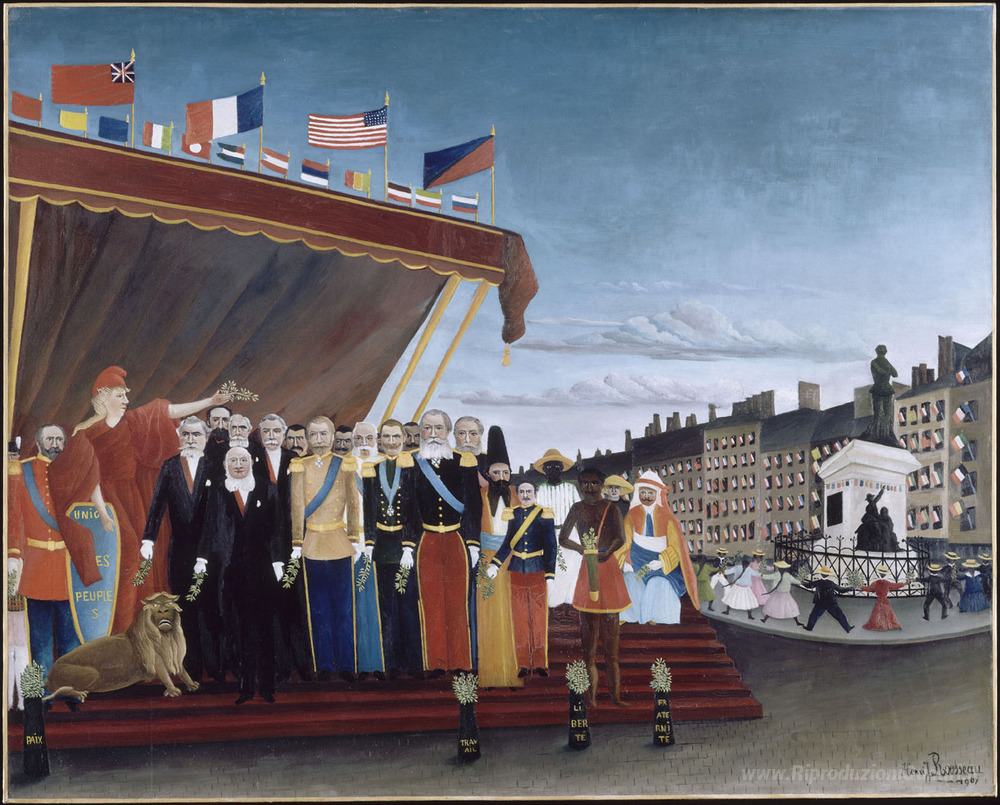 Ti offriamo una riproduzione artigianale su tela dell'opera famosa 'I rappresentanti delle potenze straniere Venendo a salutare la R' di Henri Rousseau, dal Museo delle Riproduzioni.