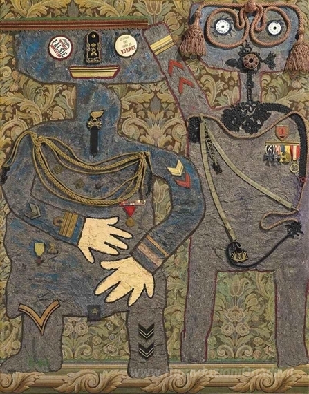 Ti offriamo una riproduzione artigianale su tela dell'opera famosa 'Il conte Suwrow Rjnniskj con il Suo Aiutante di campo Durante la' di Enrico Baj, dal Museo delle Riproduzioni.