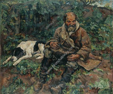 Ti offriamo una riproduzione artigianale su tela dell'opera famosa 'Il guardiano notturno con un cane (Ivan Payala)' di Pyotr Konchalovsky, dal Museo delle Riproduzioni.