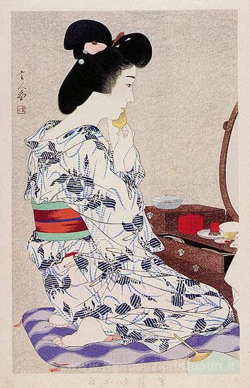 Ti offriamo una riproduzione artigianale su tela dell'opera famosa 'In un Kimono leggera estiva, con Iris' di Torii Kotondo, dal Museo delle Riproduzioni.