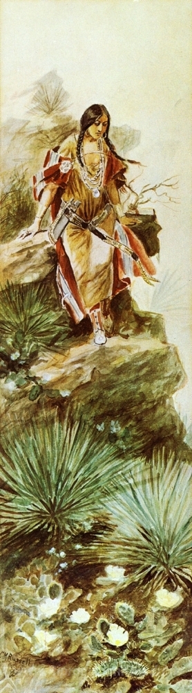 Ti offriamo una riproduzione artigianale su tela dell'opera famosa 'Keeoma' di Charles M. Russell, dal Museo delle Riproduzioni.