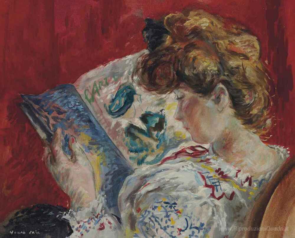Ti offriamo una riproduzione artigianale su tela dell'opera famosa 'La Lecture' di Emilio Grau Sala, dal Museo delle Riproduzioni.