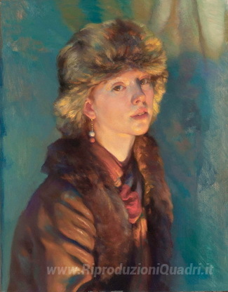 Ti offriamo una riproduzione artigianale su tela dell'opera famosa 'La ragazza con un cappello di pelliccia' di Nelson Shanks, dal Museo delle Riproduzioni.