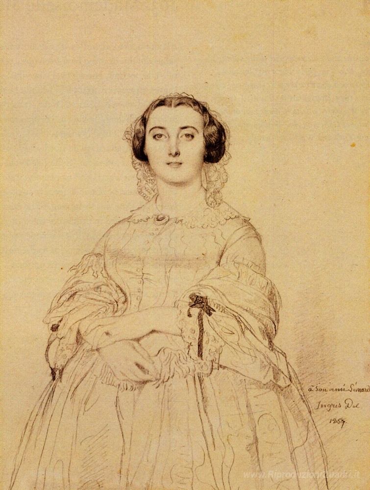 Ti offriamo una riproduzione artigianale su tela dell'opera famosa 'La signora Charles Simart, nato Amélie Baltard' di Jean Auguste Dominique Ingres, dal Museo delle Riproduzioni.