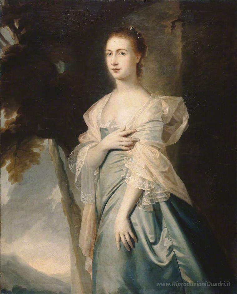 Ti offriamo una riproduzione artigianale su tela dell'opera famosa 'La signora Margaret Ainslie' di George Romney, dal Museo delle Riproduzioni.