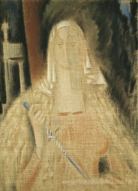 Ti offriamo una riproduzione artigianale su tela dell'opera famosa 'La Temperanza, donna che tiene un coltello' di Konstantinos Parthenis, dal Museo delle Riproduzioni.