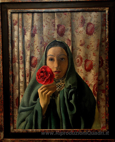 Ti offriamo una riproduzione artigianale su tela dell'opera famosa 'Lady con le rose' di Greta Freist, dal Museo delle Riproduzioni.
