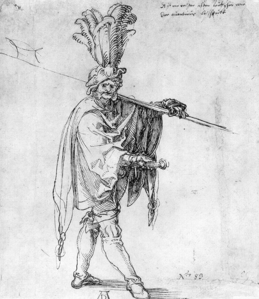 Ti offriamo una riproduzione artigianale su tela dell'opera famosa 'Landsknecht' di Albrecht Durer, dal Museo delle Riproduzioni.