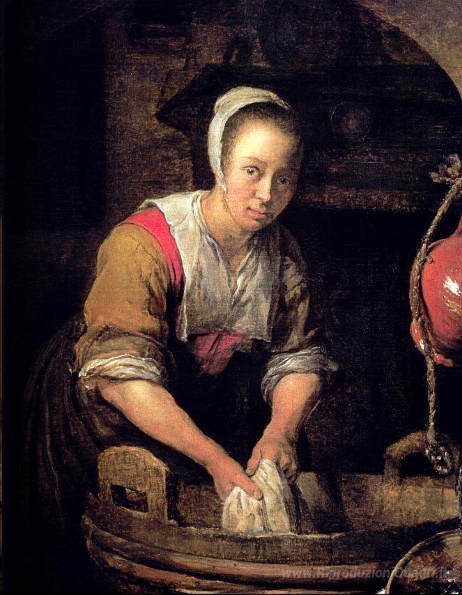 Ti offriamo una riproduzione artigianale su tela dell'opera famosa 'Lavandaia' di Gabriel Metsu, dal Museo delle Riproduzioni.