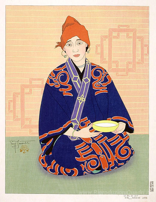 Ti offriamo una riproduzione artigianale su tela dell'opera famosa 'Le Bol De Lait Aino. Hokkaido, Japon' di Paul Jacoulet, dal Museo delle Riproduzioni.