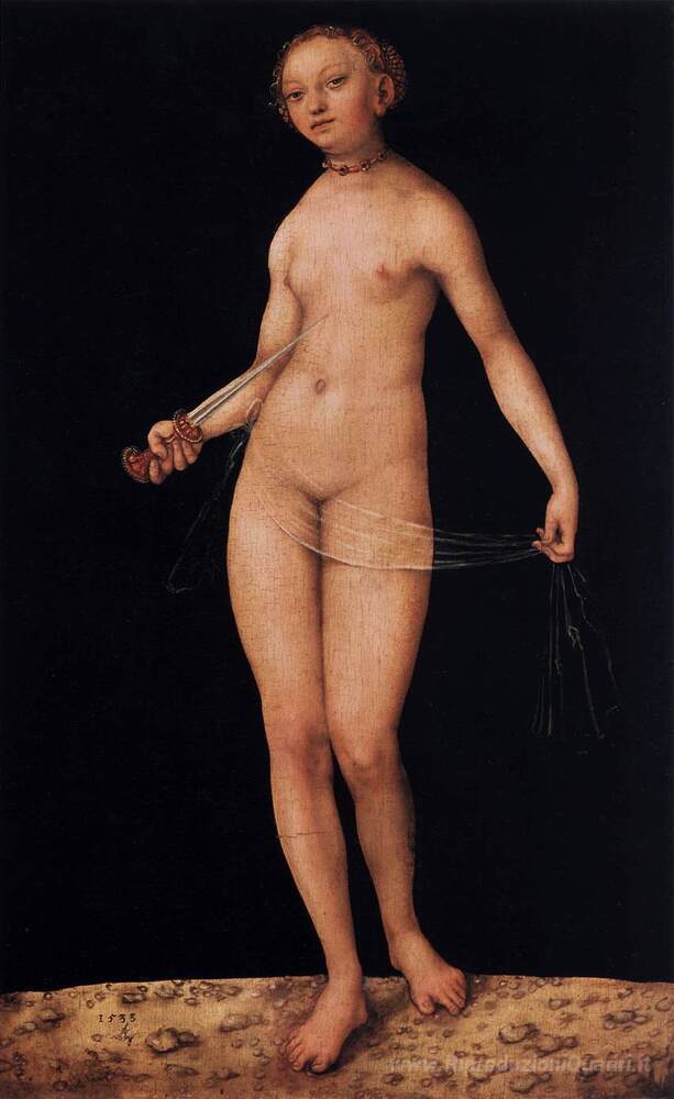 Ti offriamo una riproduzione artigianale su tela dell'opera famosa 'Lucrezia' di Lucas Cranach the Elder, dal Museo delle Riproduzioni.