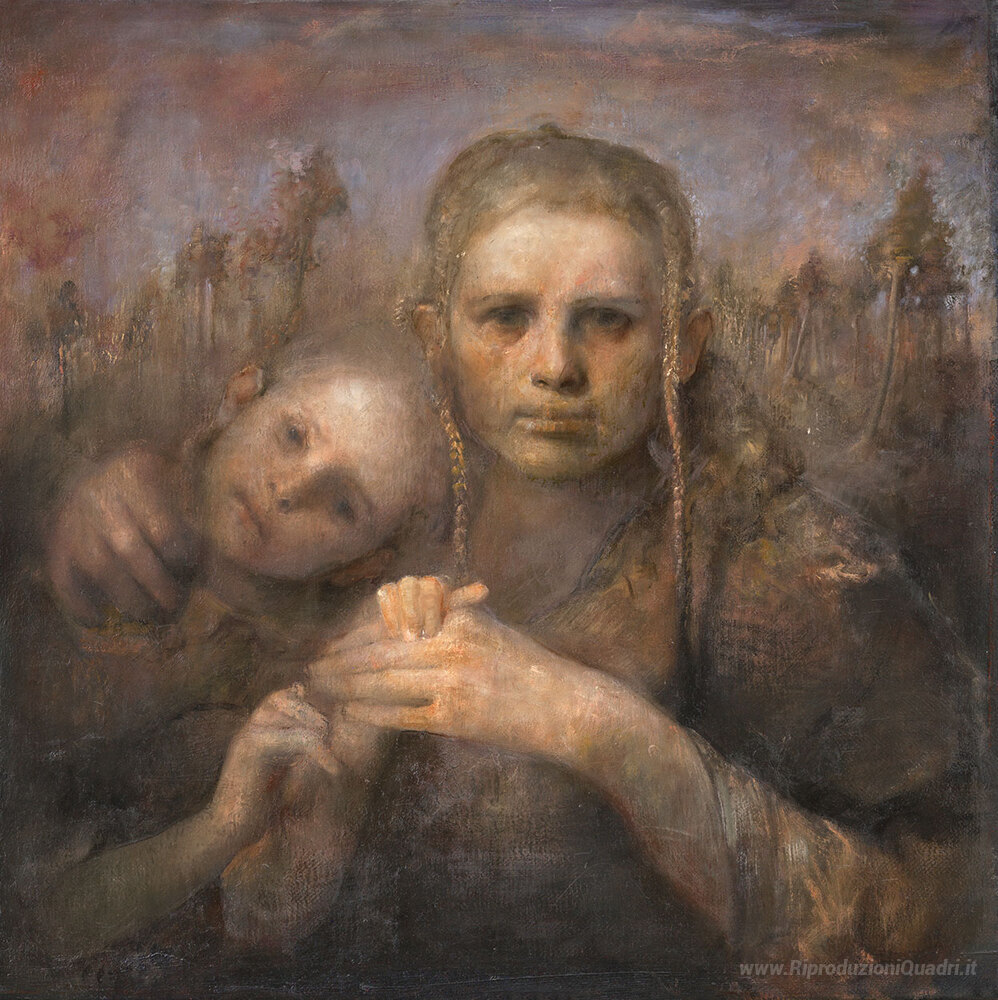 Ti offriamo una riproduzione artigianale su tela dell'opera famosa 'Madre e figlia' di Odd Nerdrum, dal Museo delle Riproduzioni.