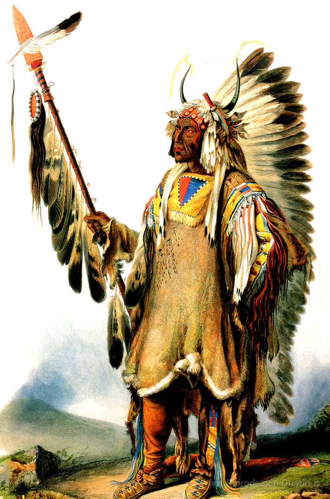 Ti offriamo una riproduzione artigianale su tela dell'opera famosa 'Mato Tope Mandan Capo' di Karl Bodmer, dal Museo delle Riproduzioni.