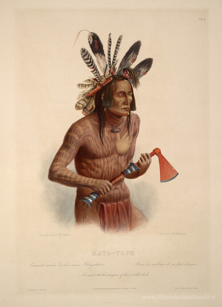 Ti offriamo una riproduzione artigianale su tela dell'opera famosa 'Mato-Tope, Ornata con le insegne del suo Deeds Warlike, piatto 1' di Karl Bodmer, dal Museo delle Riproduzioni.