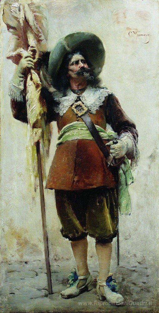 Ti offriamo una riproduzione artigianale su tela dell'opera famosa 'Moschettiere' di Konstantin Makovsky, dal Museo delle Riproduzioni.