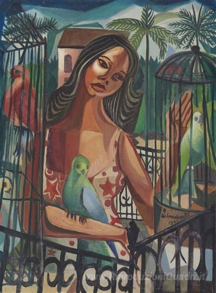 Ti offriamo una riproduzione artigianale su tela dell'opera famosa 'Mulata e Pássaros' di Emiliano Di Cavalcanti, dal Museo delle Riproduzioni.