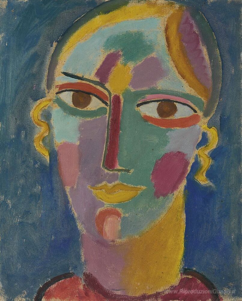 Ti offriamo una riproduzione artigianale su tela dell'opera famosa 'Mystischer Kopf: Frauenkopf auf blauem Grund' di Alexej von Jawlensky, dal Museo delle Riproduzioni.