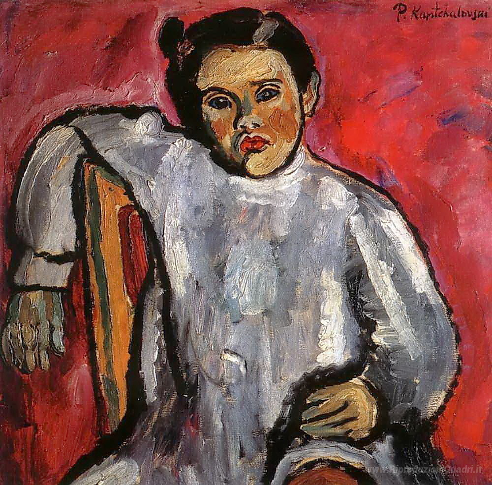 Ti offriamo una riproduzione artigianale su tela dell'opera famosa 'Natasha su una sedia (Ritratto di NP Konchalovskaya nell'infanzi' di Pyotr Konchalovsky, dal Museo delle Riproduzioni.