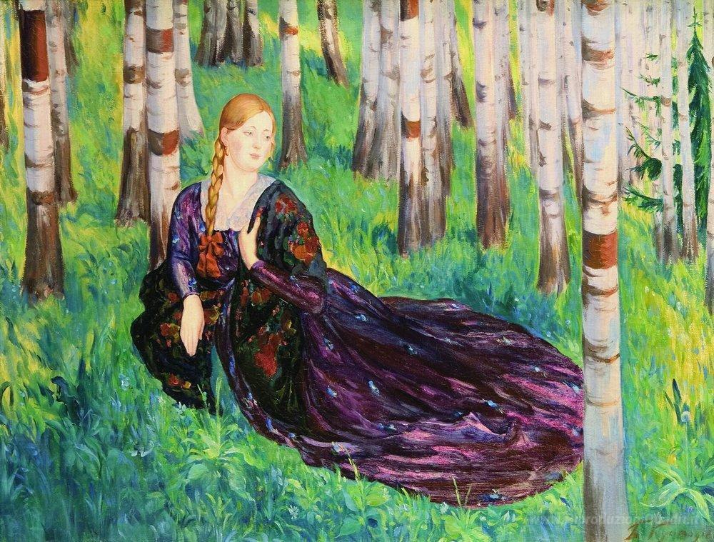 Ti offriamo una riproduzione artigianale su tela dell'opera famosa 'Nella foresta di betulle' di Boris Kustodiev, dal Museo delle Riproduzioni.