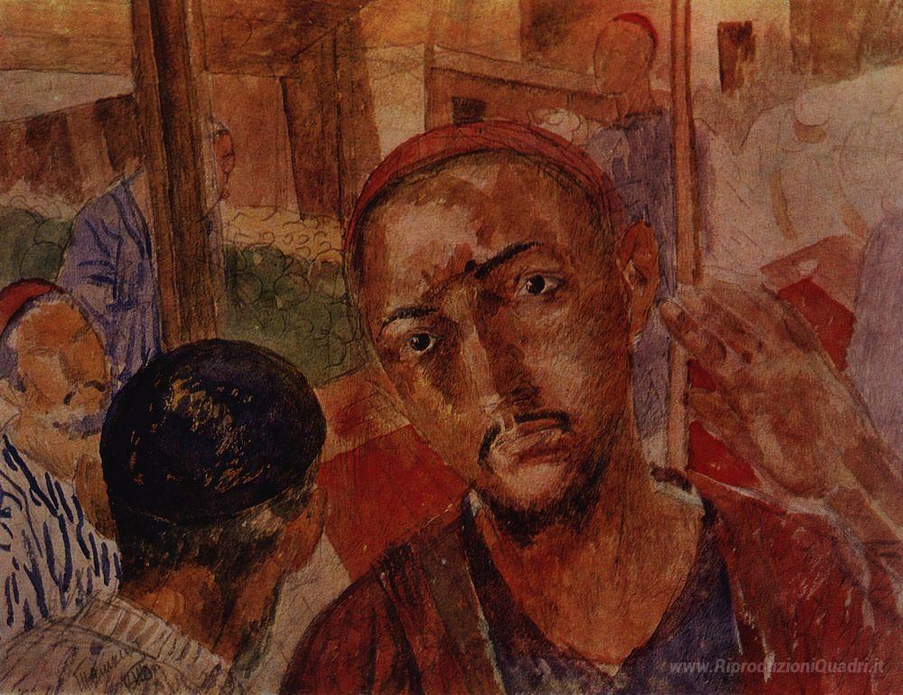 Ti offriamo una riproduzione artigianale su tela dell'opera famosa 'Nelle case da tè' di Kuzma Petrov-Vodkin, dal Museo delle Riproduzioni.