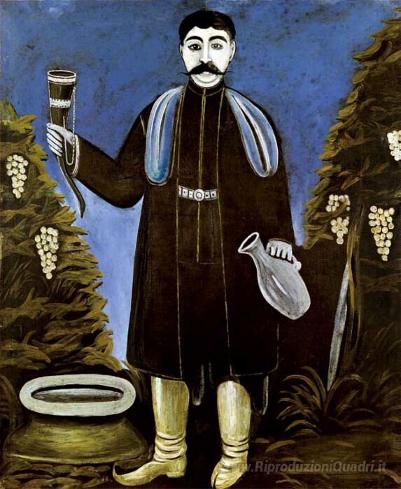 Ti offriamo una riproduzione artigianale su tela dell'opera famosa 'Noble con un corno per bere vino' di Niko Pirosmani, dal Museo delle Riproduzioni.