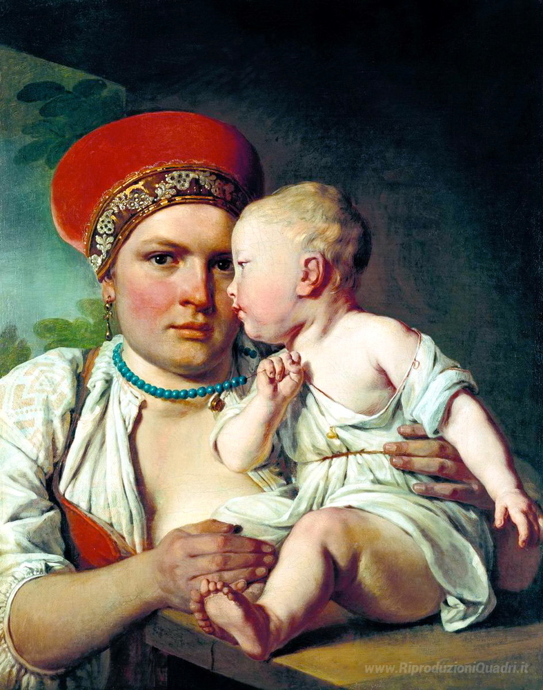 Ti offriamo una riproduzione artigianale su tela dell'opera famosa 'Nutrice con un bambino' di Alexey Venetsianov, dal Museo delle Riproduzioni.