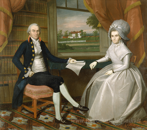 Ti offriamo una riproduzione artigianale su tela dell'opera famosa 'Oliver e Abigail Wolcott Ellsworth' di Ralph Earl, dal Museo delle Riproduzioni.