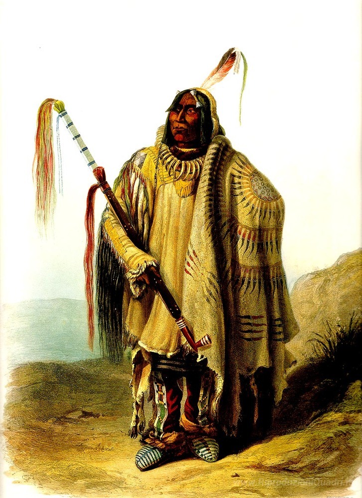 Ti offriamo una riproduzione artigianale su tela dell'opera famosa 'Pehriska Ruhpa Minatarre o Big gonfiato indiano' di Karl Bodmer, dal Museo delle Riproduzioni.