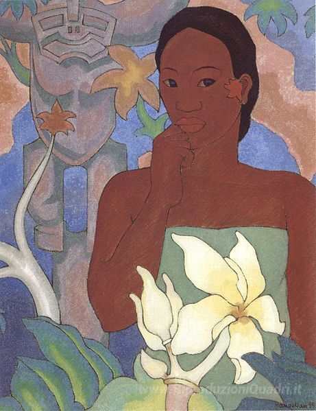 Ti offriamo una riproduzione artigianale su tela dell'opera famosa 'Polinesiano Donna e Tiki' di Arman Manookian, dal Museo delle Riproduzioni.