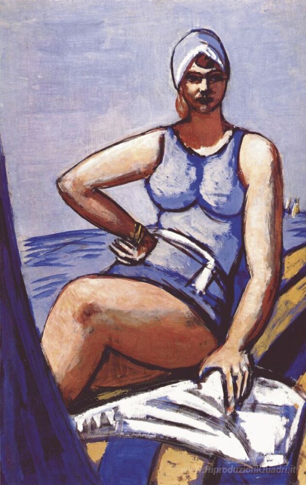 Ti offriamo una riproduzione artigianale su tela dell'opera famosa 'Quappi in blu in una barca' di Max Beckmann, dal Museo delle Riproduzioni.