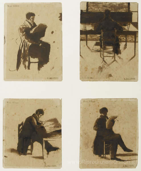 Ti offriamo una riproduzione artigianale su tela dell'opera famosa 'Quattro Vedute di uomini seduti' di Eugene Delacroix, dal Museo delle Riproduzioni.