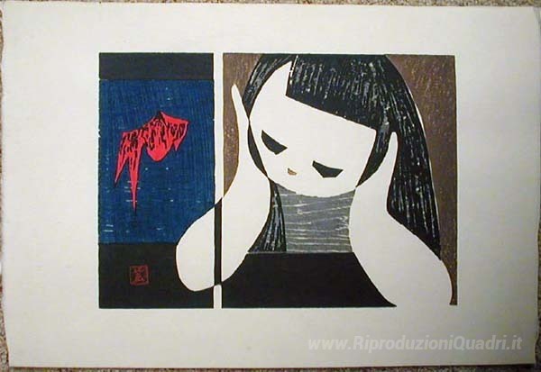 Ti offriamo una riproduzione artigianale su tela dell'opera famosa 'Ragazza che si distende (Fish)' di Kaoru Kawano, dal Museo delle Riproduzioni.