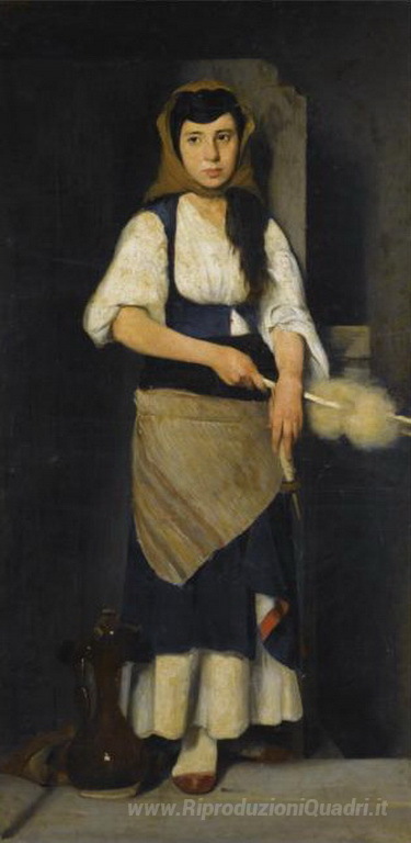 Ti offriamo una riproduzione artigianale su tela dell'opera famosa 'Ragazza con Distaff e mandrino' di Polychronis Lembesis, dal Museo delle Riproduzioni.