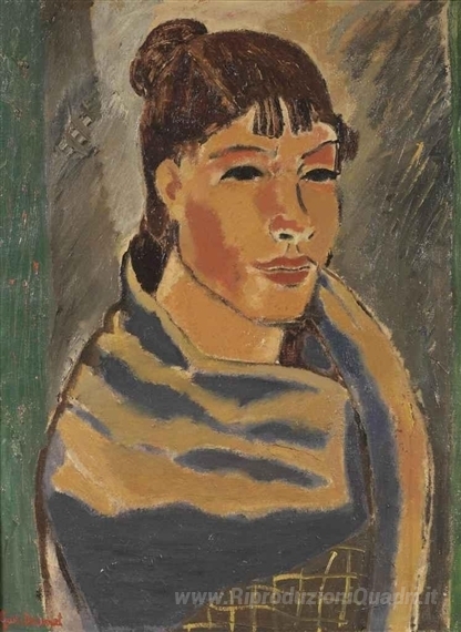 Ti offriamo una riproduzione artigianale su tela dell'opera famosa 'Ragazza con la sciarpa blu' di Gustave de Smet, dal Museo delle Riproduzioni.