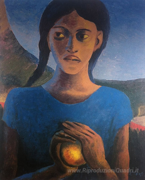 Ti offriamo una riproduzione artigianale su tela dell'opera famosa 'RAGAZZA CON L'ARANCIO' di Gerard Sekoto, dal Museo delle Riproduzioni.