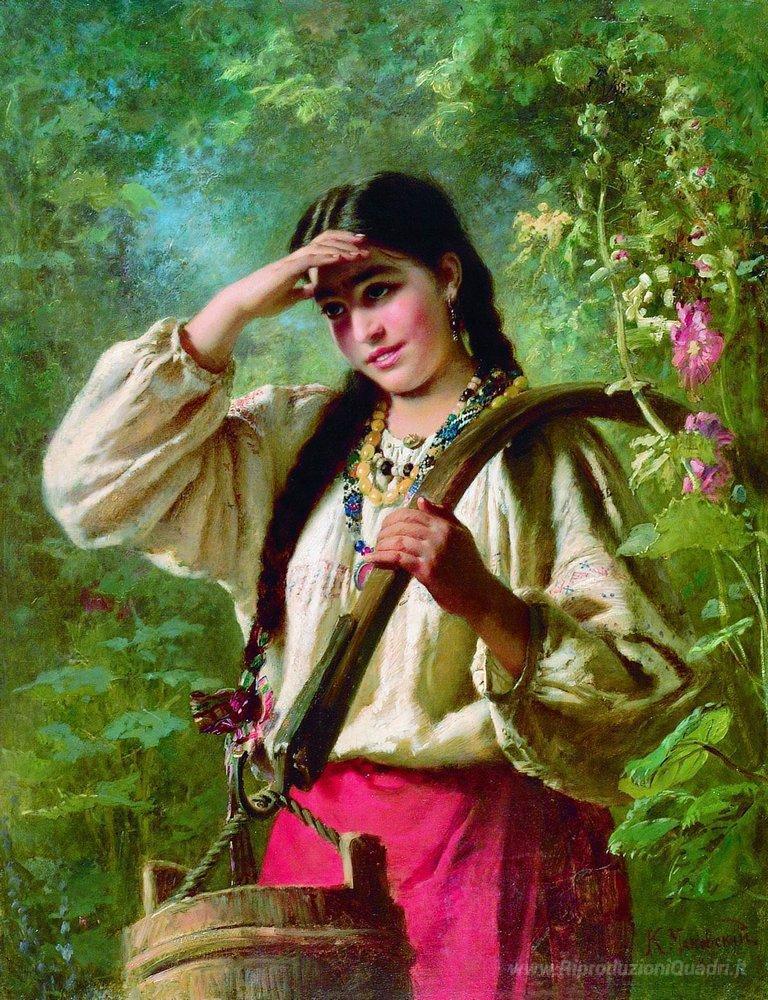 Ti offriamo una riproduzione artigianale su tela dell'opera famosa 'Ragazza con un giogo' di Konstantin Makovsky, dal Museo delle Riproduzioni.