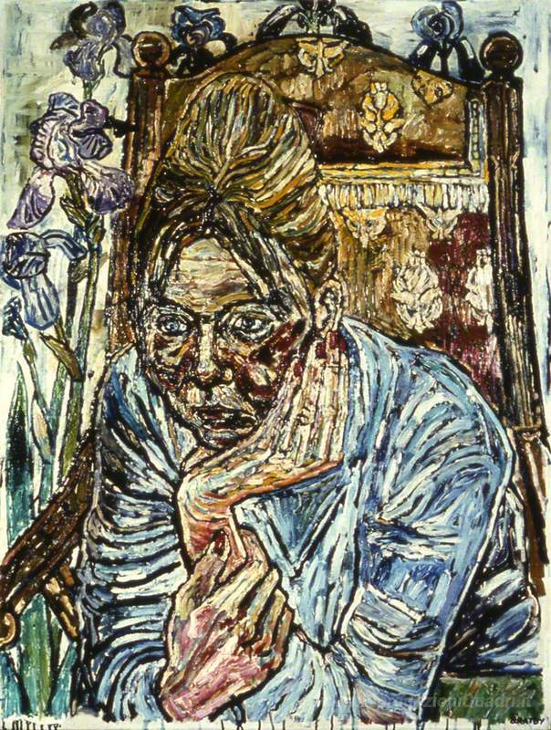 Ti offriamo una riproduzione artigianale su tela dell'opera famosa 'Ragazza in Alta-Backed presidente e Iris' di John Bratby, dal Museo delle Riproduzioni.