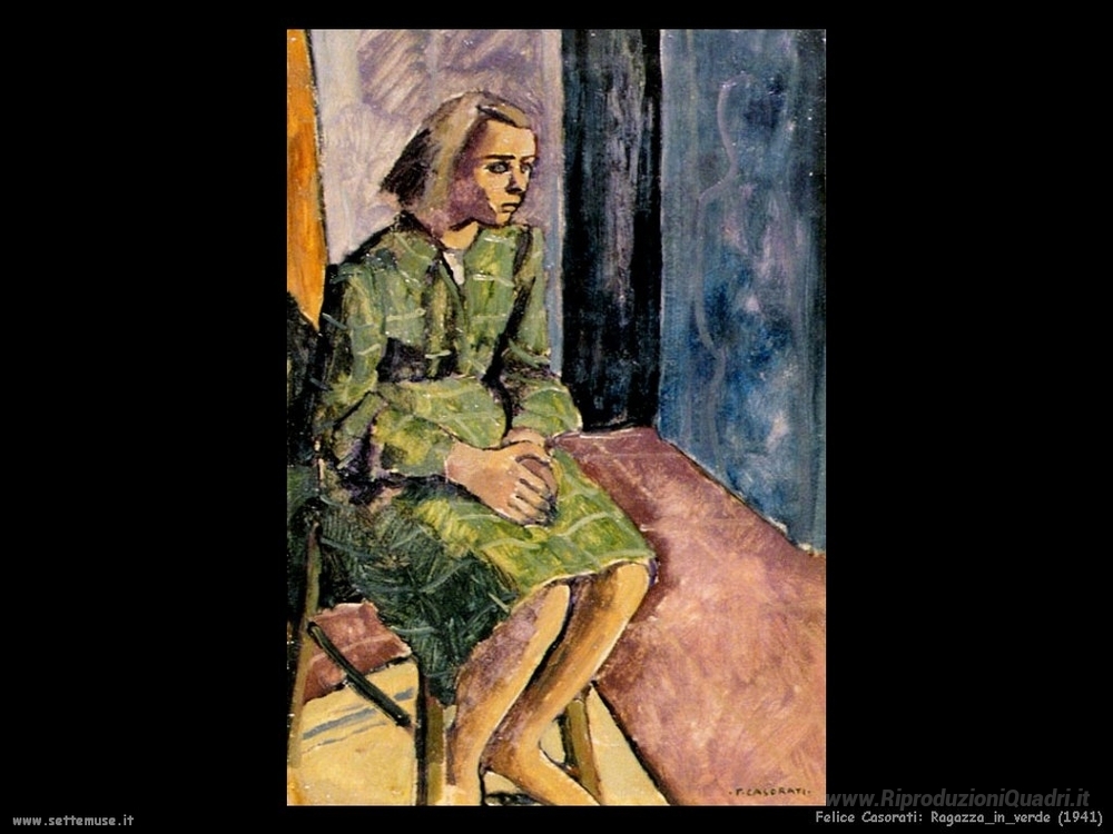 Ti offriamo una riproduzione artigianale su tela dell'opera famosa 'Ragazza in verde' di Felice Casorati, dal Museo delle Riproduzioni.