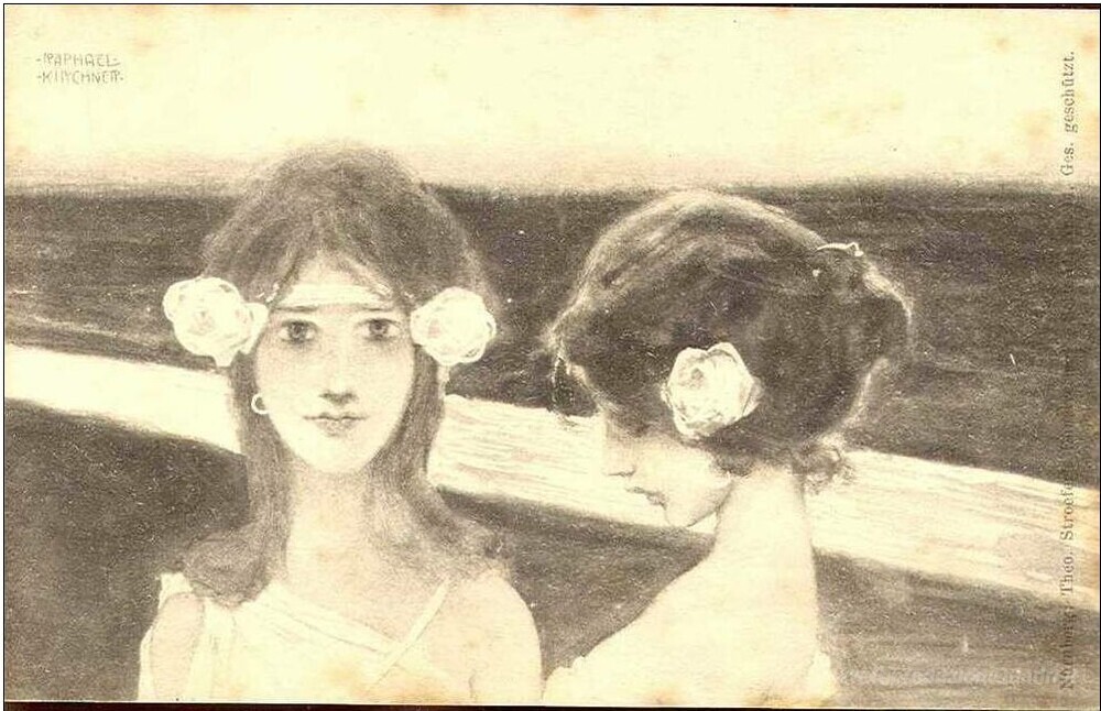 Ti offriamo una riproduzione artigianale su tela dell'opera famosa 'Ragazze greche' di Raphael Kirchner, dal Museo delle Riproduzioni.